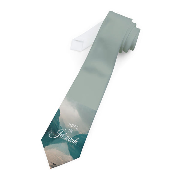 Hope In Jehovah necktie beautiful artwork on them and watch an instant favorite wardrobe choice come to life. Made of 100% polyester, it is ready for a vibrant color print and offers a silky finish along with a keeper loop for holding the tie tail. You will be dress to impress and more importantly encourage others with this spiritually encouraging thought.