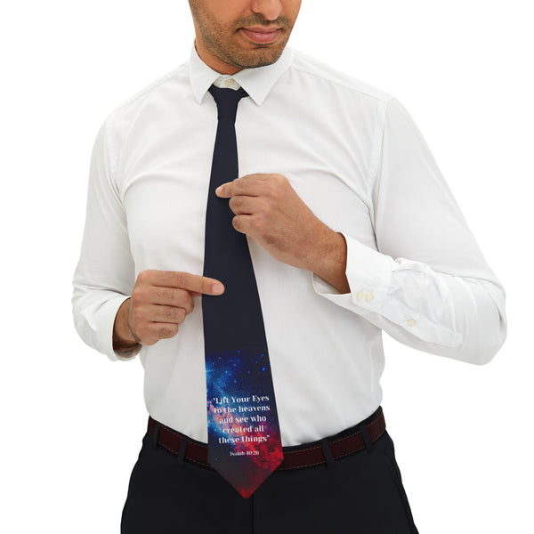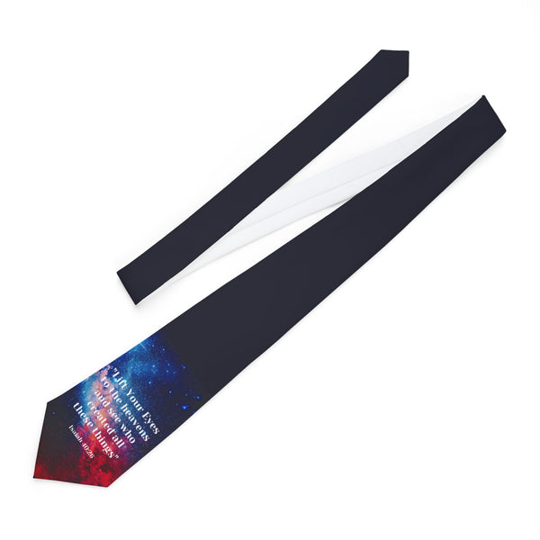 Raise your eyes to the heavens necktie beautiful artwork on them and watch an instant favorite wardrobe choice come to life. Made of 100% polyester, it is ready for a vibrant color print and offers a silky finish along with a keeper loop for holding the tie tail. You will be dress to impress and more importantly encourage others with this spiritually encouraging thought.